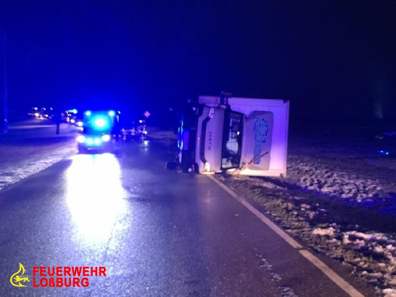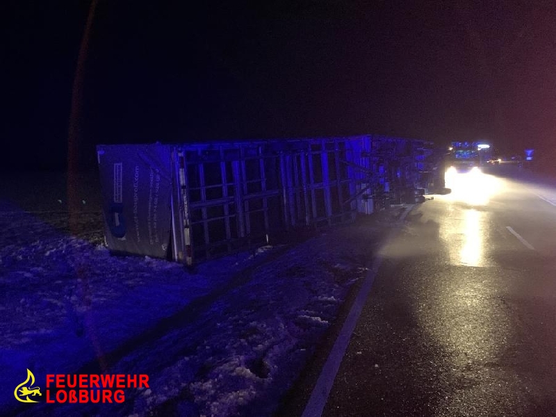 Einen umfangreichen Einsatz löste heute am Abend das Sturmtief "Bianca" auf der L408 aus. Ein Anrufer meldete einen umgestürtzten LKW mit Anhänger. Da anfangs unklar war, ob sich unter dem Gespann, dass über die Gegenfahrbahn in den Straßengraben gestürtzt war, befindet, wurde vom schlimmsten ausgegangen. Leitstelle Freudenstadt alarmierte neben den Abteilungen der Feuerwehr Loßburg auch die Feuerwehr Alpirsbach.