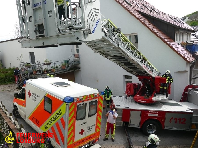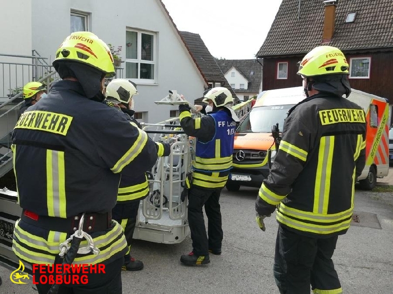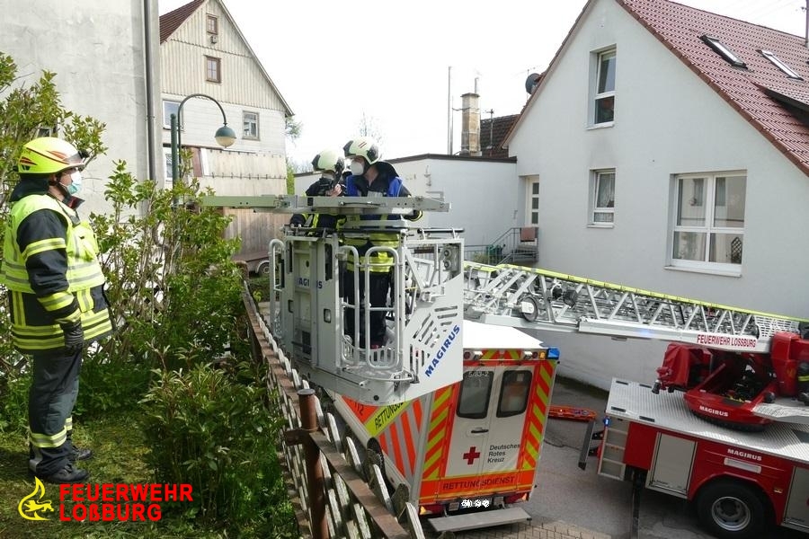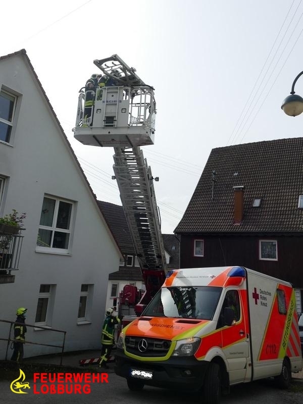 Die enge Bebauung, eine steile Gasse sowie Dachständerleitungen ringsum machten die Positionierung der Drehleiter extrem schwierig. Nach kurzer Zeit konnte jedoch der Patient in der Schleifkorbtrage aufgenommen und zum RTW transportiert werden.